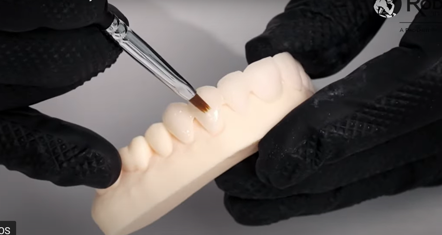Rodin N₂‑Free Glaze is a light-curable universal sealant, adhesive, and chemical primer that strengthens all printed restorations—Drop glaze into denture base sockets before seating teeth, brush excess on cameo surface and cure.